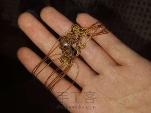 心形的延长线编一段之后,取一根轴线把编心形的延长线的轴跟绕都绕上。先绕一根,向下对折之后再绕另一根,那样两个线尾就都朝下。(图上我用两根轴了,发现错了又拆了。)