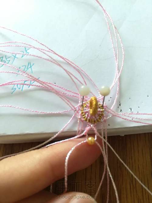 先编两根,然后在轴线上两侧各挂一根三股金线(不编,就只是挂上,也可以后面用针穿上)