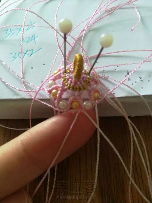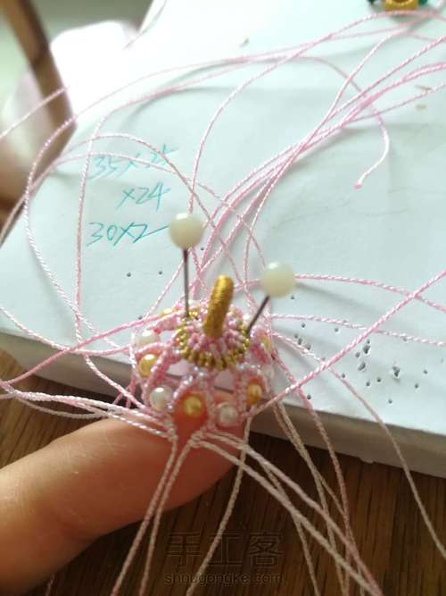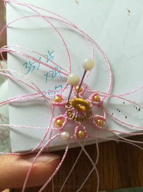 另取一根金线在所有二十四根粉线上编一圈斜卷,在背面固定好,剪去线头烧一下