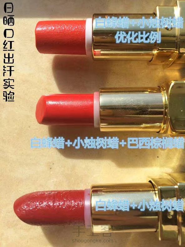 35度高温环境下,手工口红连续放置6个小时后,不同的用蜡配比,不同的出汗情况对比!