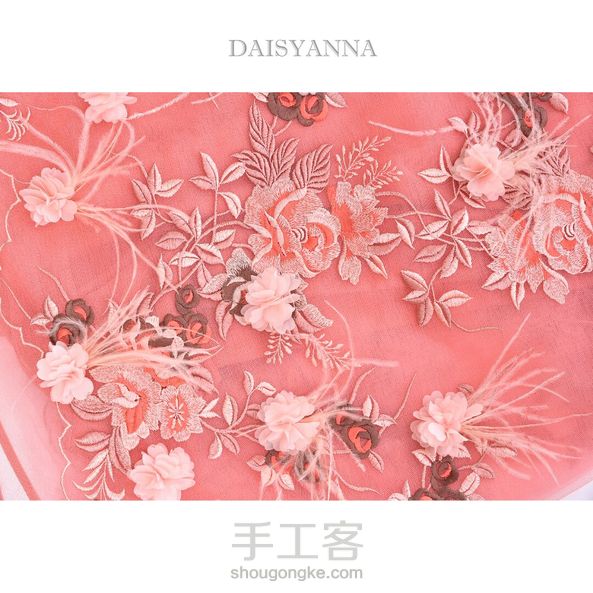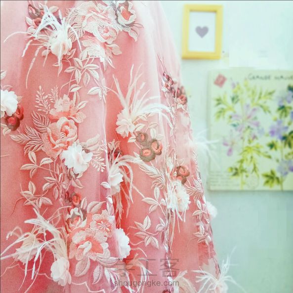 雅致的花纹图案刺绣与手工立体花鸵鸟毛的结合,显得更加的生动盎然。