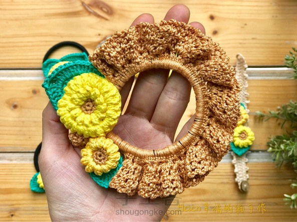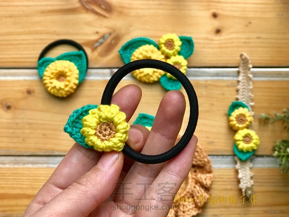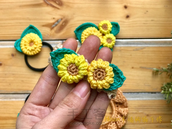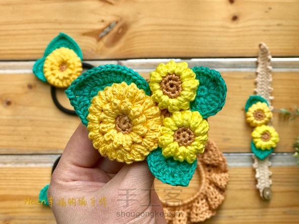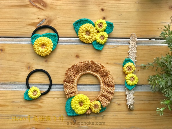 【Helen幸福钩编特训营】手工客新课作品:第九课我们要学习基础花饰的制作,专门为了此次课程设计的新作品——太阳花花饰系列,有发圈,发绳,胸针和手链几个部分。让大家系统的了解这个主题的作品,亲身体会发饰的制作。