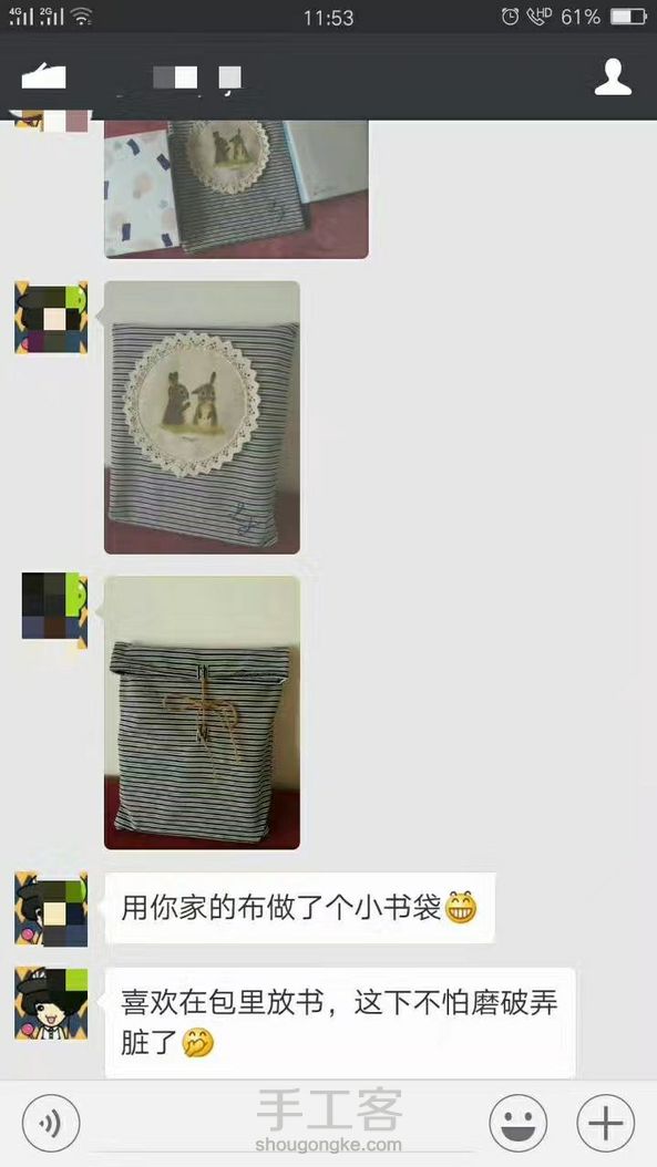 这也是位爱书之人,怕包里书磨破了,特意为书做了个小袋子。说是第一次做手工,你们能看出来吗?反正我没看出来了。