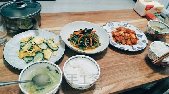 3月30日 晚餐 辣白菜炒五花肉,香辣肉丝,黄瓜鸡蛋,西兰花豆薯汤