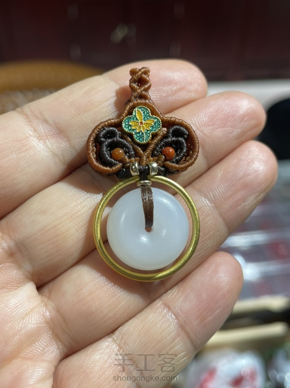 《很漂亮,感谢老师分享的教程,刚开始线选错了用的扁蜡线,导致花瓣上面有很多小孔,之后补救了一下串了一些珠子,成品很喜欢。》