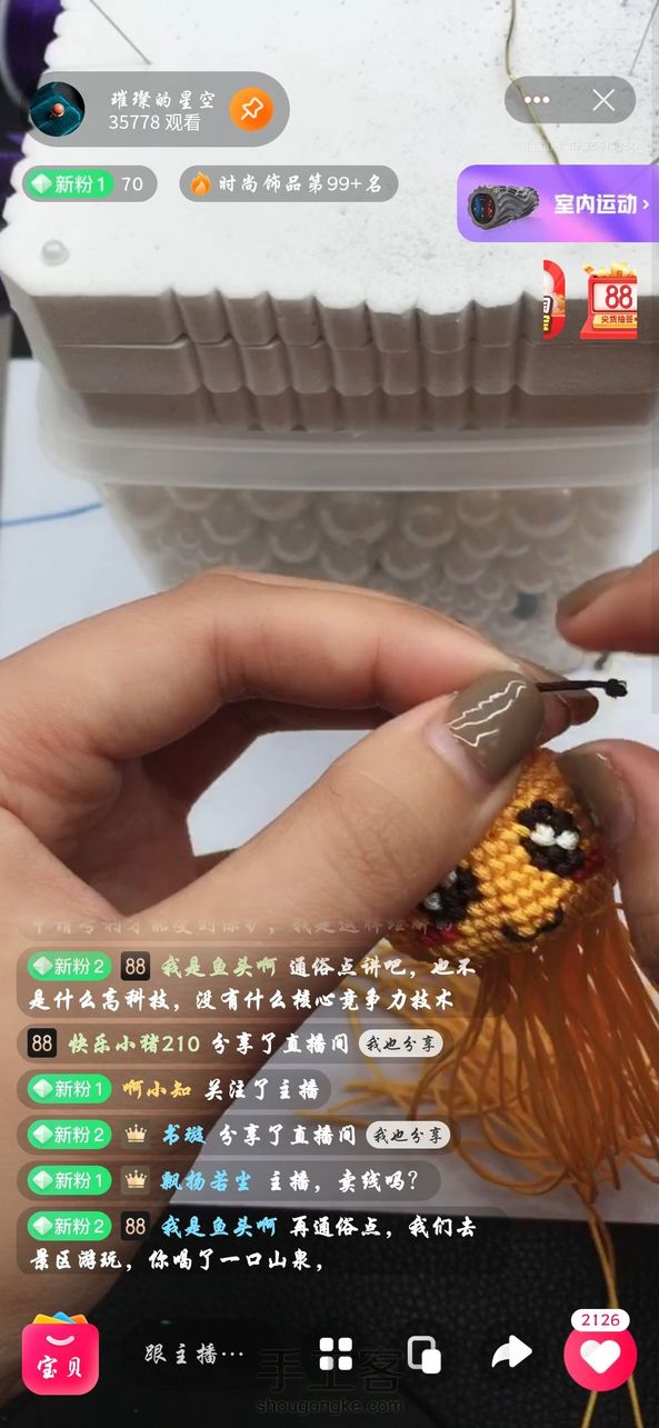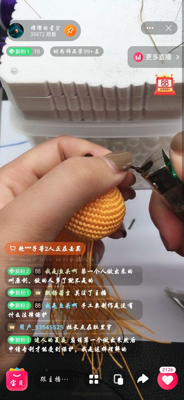 今天刷到一家直播间,每天拿各位老师的原创做所谓的“公益教学”来赚取流量,今天这么巧做的刚好是我的小蜜蜂被我看到。老板每天都在侵权,但是居然理直气壮地说编绳不受法律保护,第一个人编是原创,编的人多了就不是原创。那个“我是鱼头啊”就是老板,大家看看他说的话!我们这些原创维权艰难!