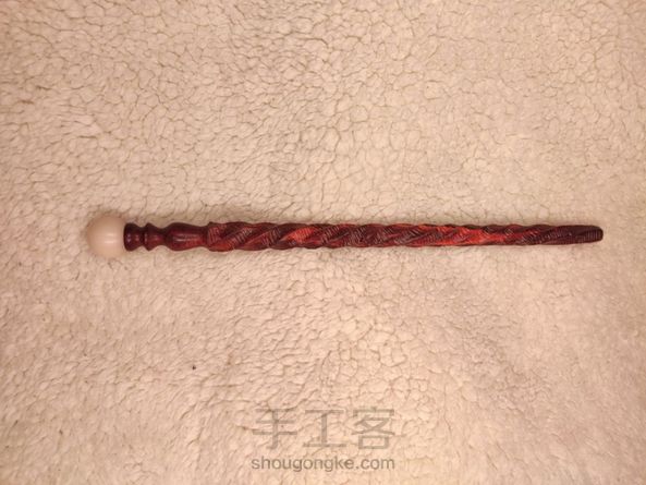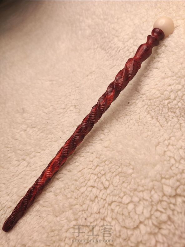 科檀镶菩提根木簪:权杖一。 仿制 XHS作者@小意手工 的《水晶球里装着太阳系转动形成的魔杖》所制作的发簪,取名权杖一,为什么叫权杖一呢?因为我很喜欢这位作者的调性风格,所以今后还会仿制这位作者的作品,那时候就会有权杖二、权杖三、权杖X等等。 这支簪子长度17.5厘米。 材料:科檀、菩提根原籽。 制作工具:车床、牙机、砂纸。 制作过程:车床出锥形圆直簪杆大型,簪杆大头车宝瓶形状及4毫米圆榫,粘接开4毫米孔洞的菩提根原籽,车去菩提根的外皮,砂纸打磨菩提根及宝瓶形簪头至3000目。余下簪杆部分画五条螺旋线,用牙机球刀(5㎜)沿画出的螺旋线雕刻出凹槽,换1.5毫米小球刀在凹槽内刻画横向纹路,最后猪毛刷清理木屑并布轮打蜡抛光,完工。