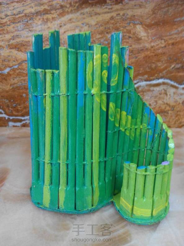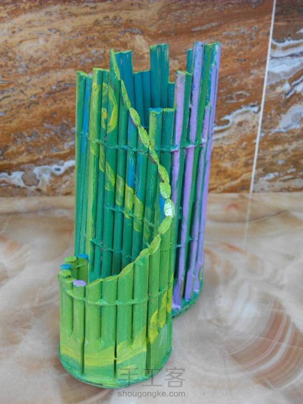 用一次性筷子做的笔筒,上了色=^_^=虽然手工有点粗糙,不过完成后挺开心的
