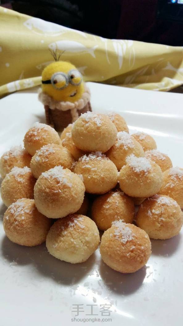 今晚做的椰丝小球和羊毛毡小黄人合影辣!