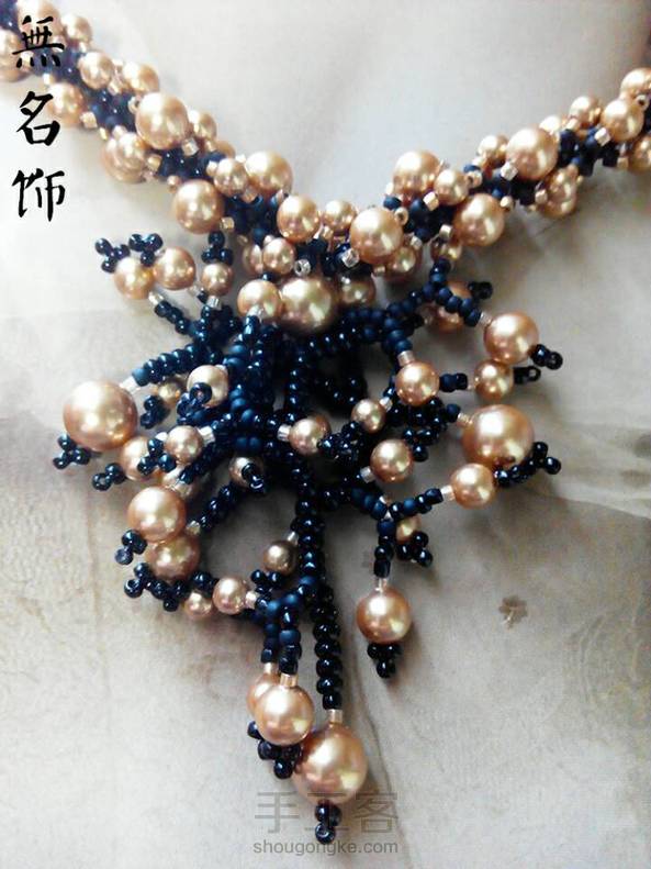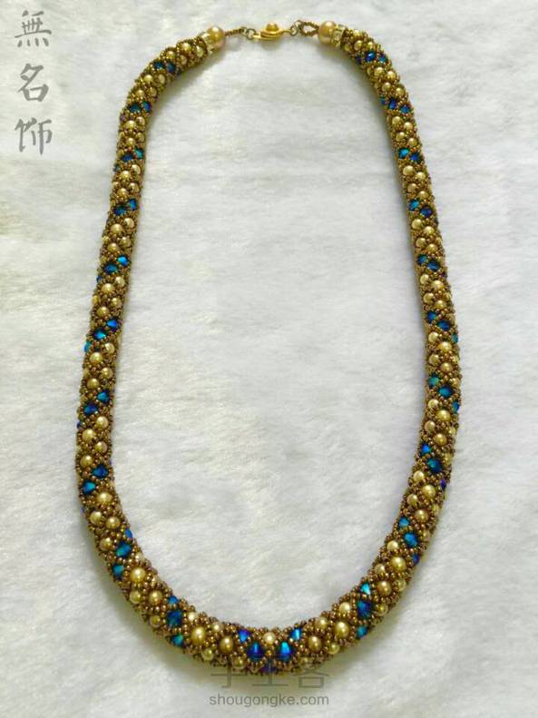 我很笨……当时做第二款只用了一根0.14MM的鱼线从中间往两边串了差不多三天(线长容易打结费时间),配了施华洛世奇全彩水晶,美中不足用了低档项链头……如换手工串珠项链头就好很多~这款很多人都做过,不过多是手链,遗憾送了陌生人……第一款施华洛世奇仿珍珠日式风格,用砗磲也做了这款,材成本差价比较大。
