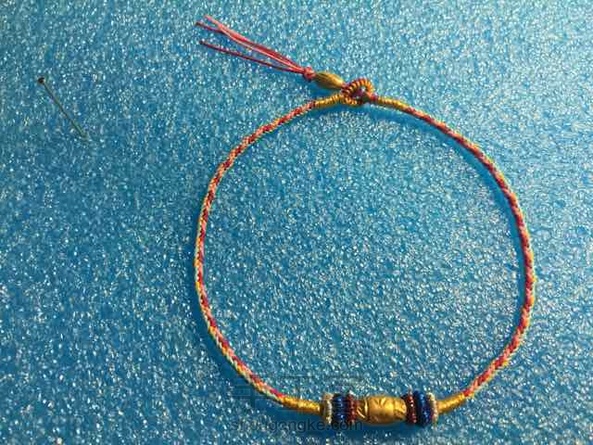朋友的三个金珠终于还是没能编到一个款里,编了一个脚链,一个手链,脚链的穗穗准备再穿几颗小金珠