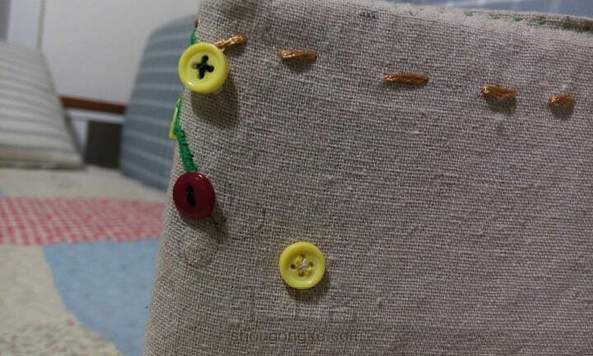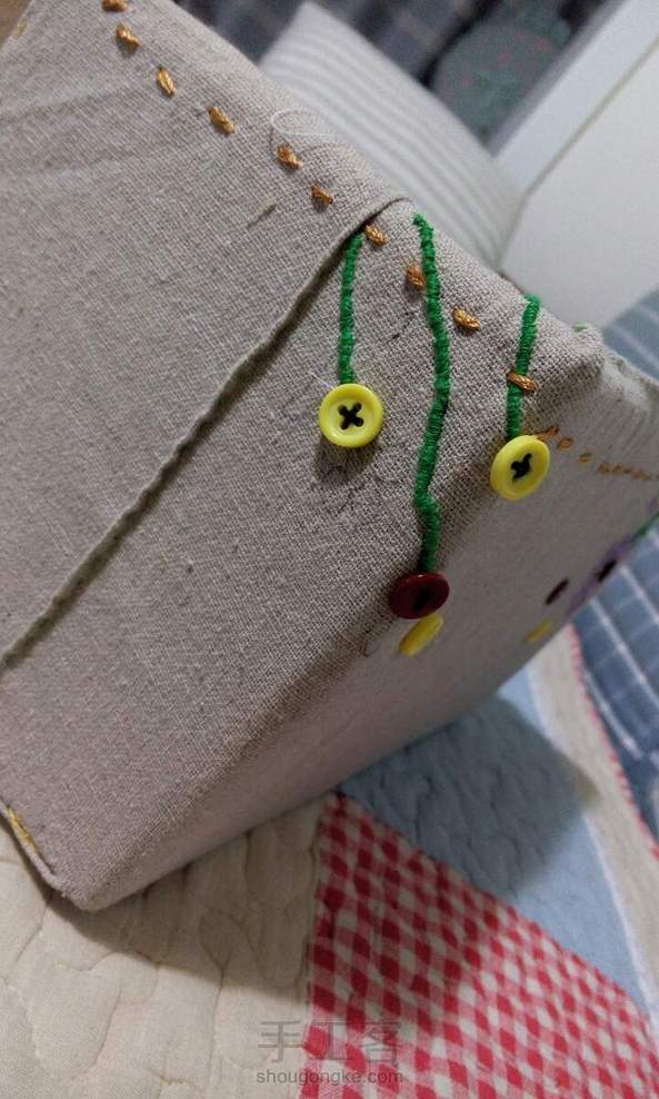 用粗布、纽扣和纸箱做了个收纳盒,第一次绣的花歪歪扭扭,好笨拙