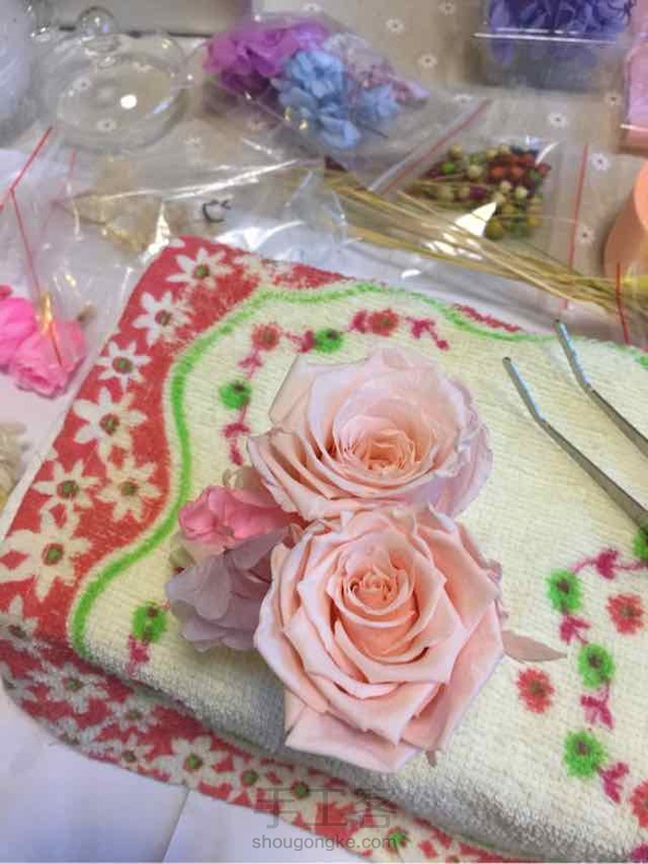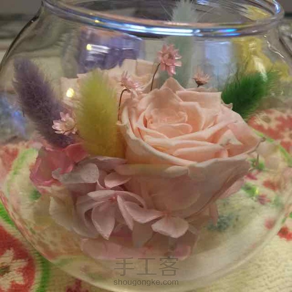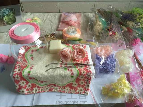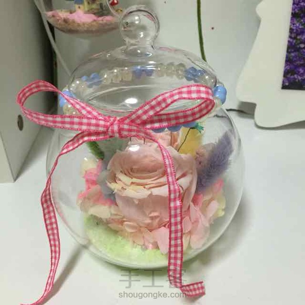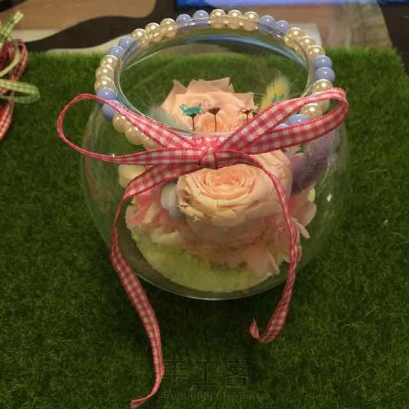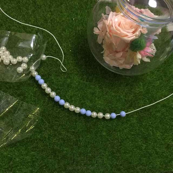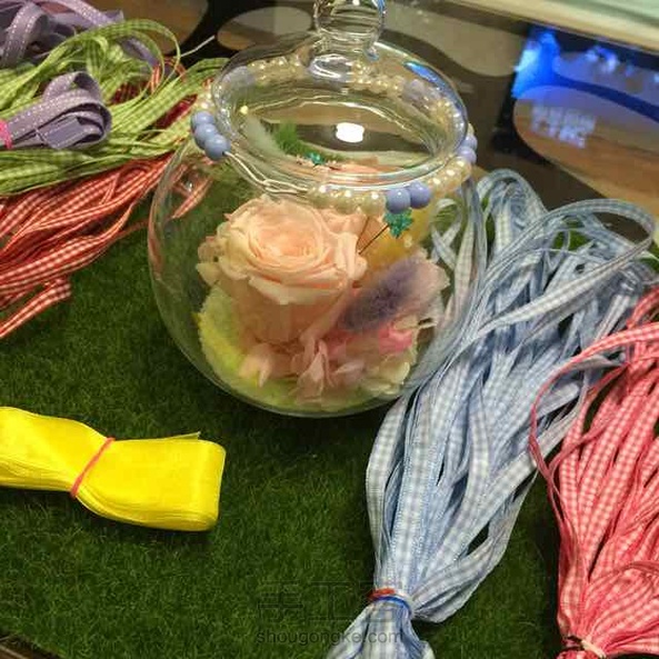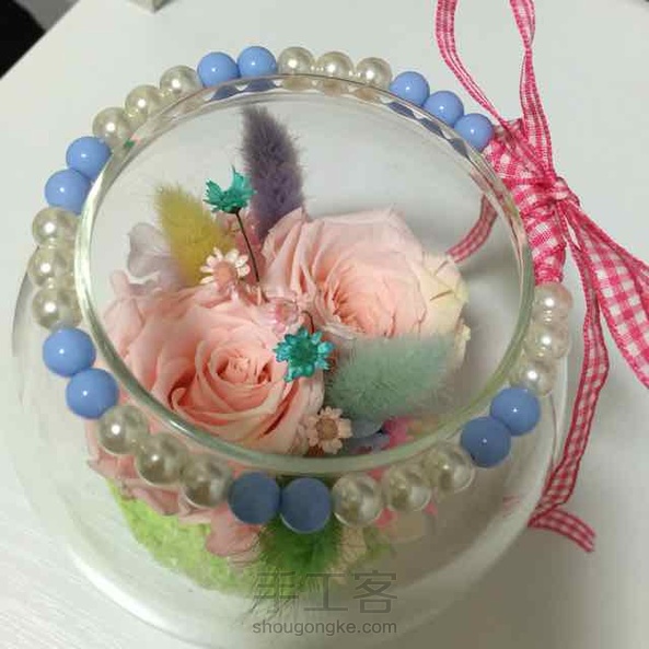 少女梦幻 其实我最不愿意做这种投入式的桌摆,超级累,因为一不留神就与最初设想的相差甚远,我的肉手也没那么灵活,在瓶里操作起来好累,但是整个过程是幸福的,快乐的。珍珠圈本想放在瓶底,可是实在放不进去,就套在了瓶口处。系上彩带,一股小清新风悠然吹来。^_^