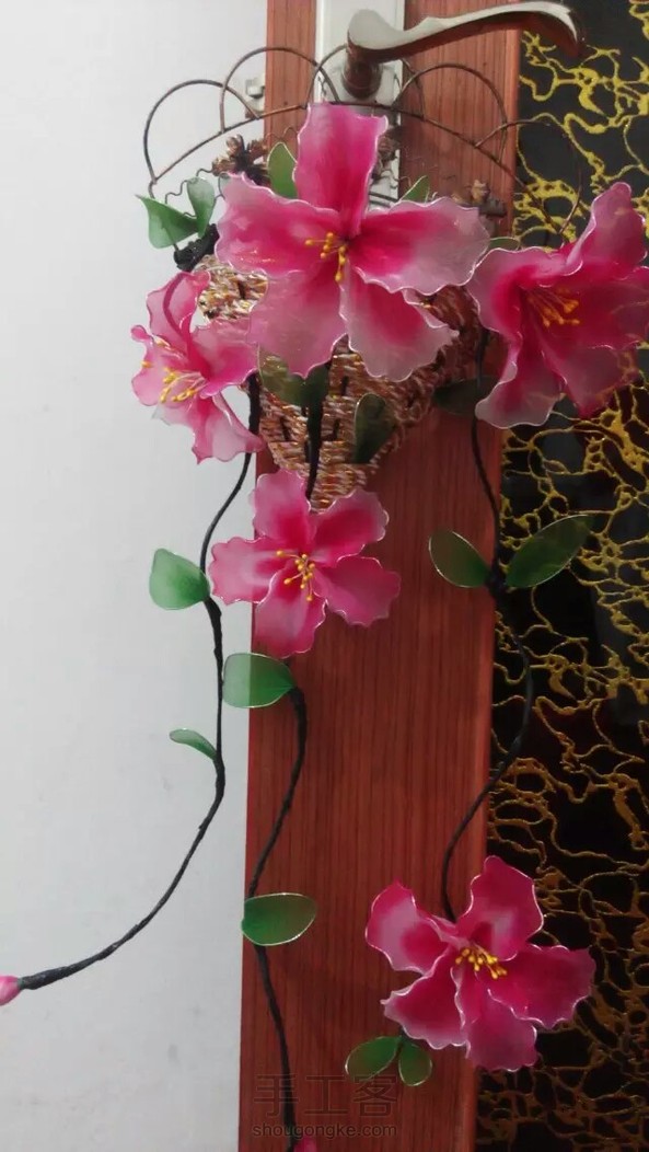 《很漂亮,感谢老师分享的教程,刚开始线选错了用的扁蜡线,导致花瓣上面有很多小孔,之后补救了一下串了一些珠子,成品很喜欢。》