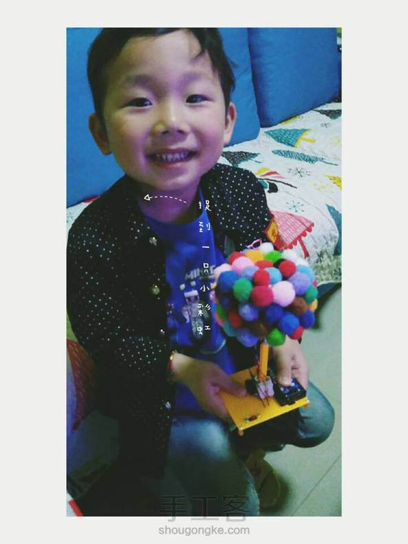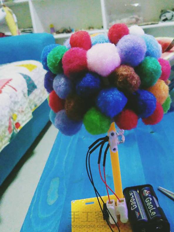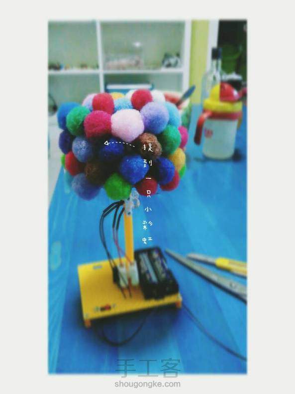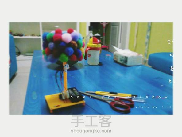 handwork-很多电线,正极负极大乱开关不插电环保电池彩虹树简版candy亲子制作台灯。 -candy的作业,接电线什么的我这个数理化不好的人并不爱。candy太小,亦不会。 不过他真的全程参与,帮我排列工具,拿装饰的小球。 所以,真的是亲子手工,没错。