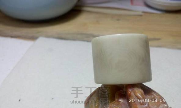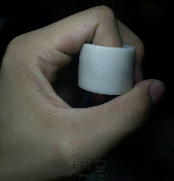 拿象牙果做了一个扳指,手工磨的,一开始挖的时候没有掌控好,内孔没避开、有一道裂,还有一个挖深了的槽。有趣的是:当时木有细砂纸拿磨刻刀的油石水磨抛了一下光,本来不明显的纹路一下全出来了!很漂亮有木有!