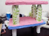 用废弃纸箱和矿泉水瓶做了个置物架,虽然有点糙,但挺实用的喔😜
