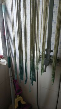 今天刚编织的,用前几天染得线编的,染的颜色不均匀,凑合吧