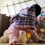 用爸爸破掉的衬衣主体部分做了个抱枕套,衣领部分便改设了这款三角狗狗帽,儿子戴着自带喜感 为母心里也喜滋滋滴~