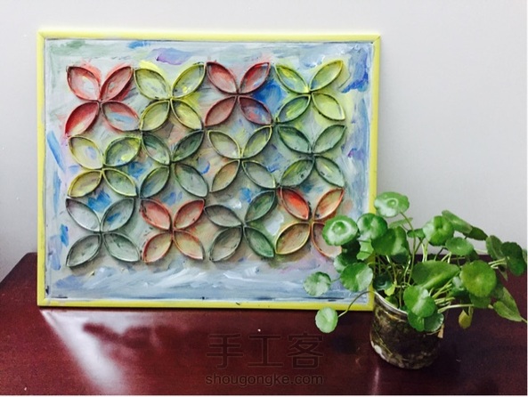 选几支不同颜色的颜料乱涂,再把餐纸芯剪成的圈按规则贴上去