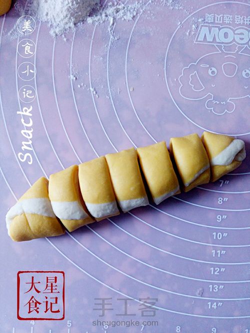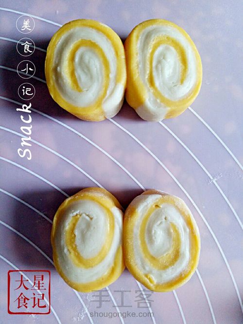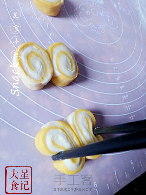 把切好的馒头面朝上,找到两个对称的花纹贴在一起。