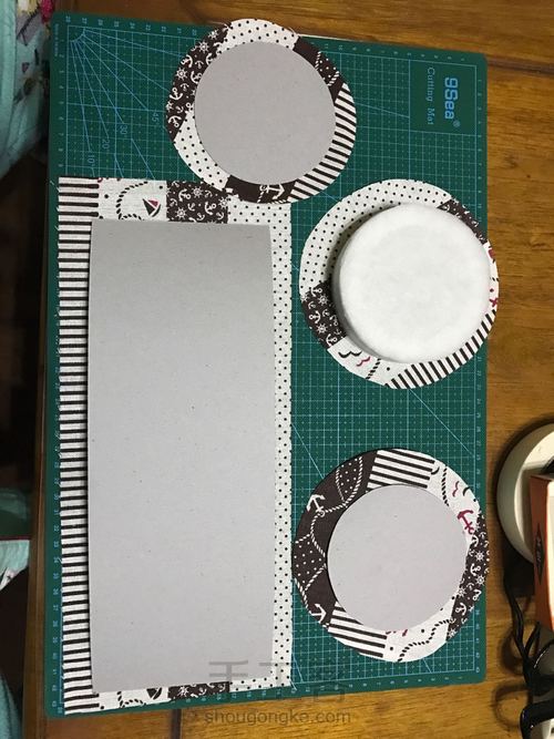 桶外侧贴布我忘记拍照了,还有桶底,做得太起劲儿了。图为桶里布,把长方灰卡纸包起来,三面包,先长边,后短边。