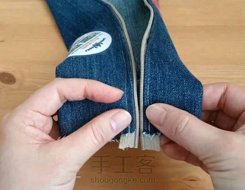 成如图的尺寸,再准备一根拉链,两个拉链头,记住,裁牛仔裤腿的时候,一定要如图一样,压线的位置在中间,这样才比较好看。