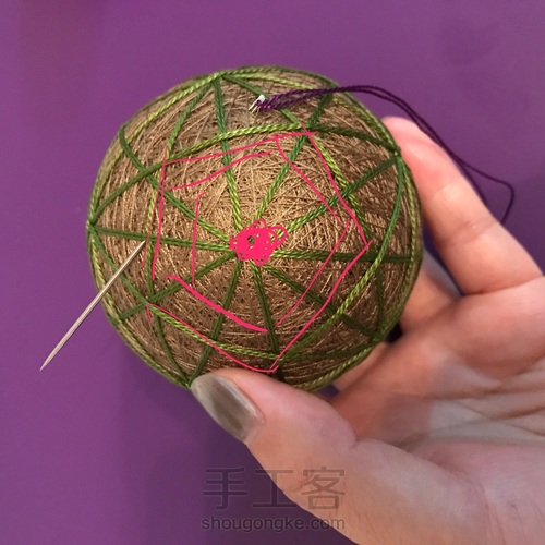 选取和等分线相同颜色的线,在5边形中心做松叶绣,具体绣法如下图