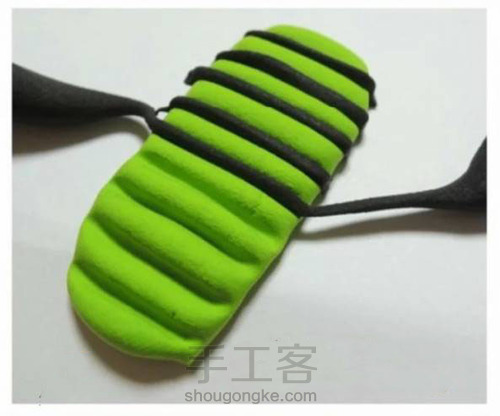 绿色粘土呈长条状压扁,用笔芯压出一条条棱。