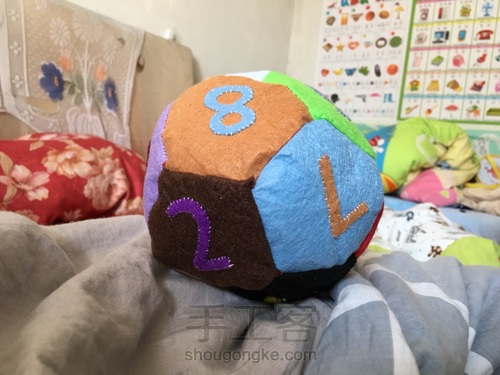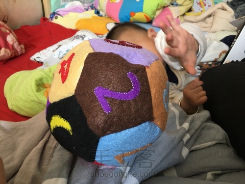 之后就把它们都缝起来,记得正面对正面缝,最后留个返口,翻出正面后塞棉花,返口用暗缝缝好,一个球就做完了。第10步: