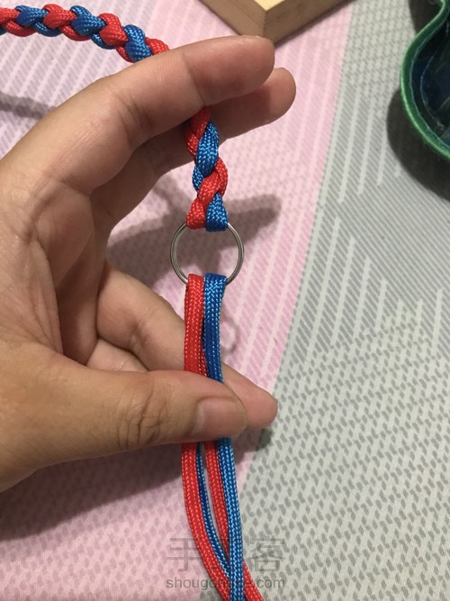 先取红蓝3米各一根对折穿过钥匙环