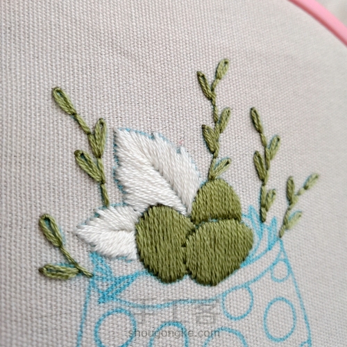 枝条上的小叶子是3股线雏菊绣。从叶子近茎端出针并入针,绣线不用拉紧。