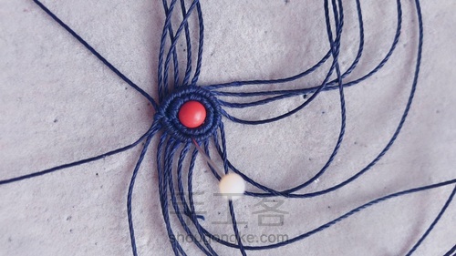 后面一根从上面拉过来打一个反斜卷结。然后穿珠