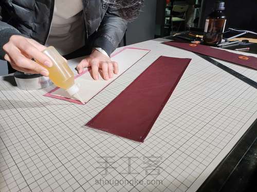 用直尺比对好对面皮(中)粘贴部分进行刷胶。