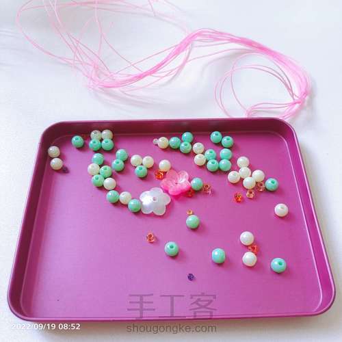 再对穿一颗3的米珠,对穿的线再从贝壳花中间的孔穿下去