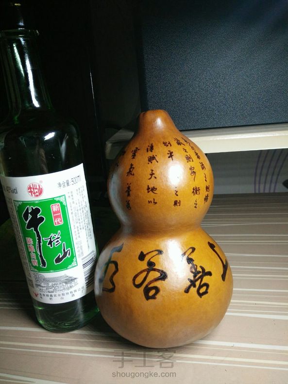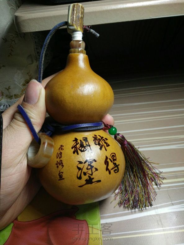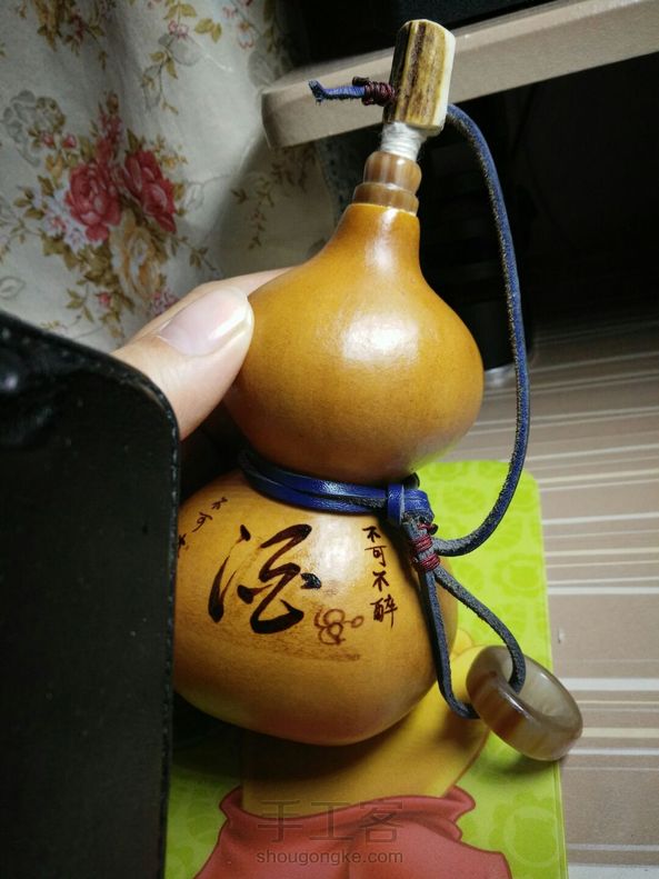 纯古法自制酒葫芦 ,35天的工,主要是糯米防渗五次。西藏血丝牦牛角做口,塞子,,黑牛角的环,牛皮的绳子,,苏州穗子,手工烙画(画,字内容可订制),(大小容量可订制),防渗是否成功(看①装酒后在酒葫芦下面放面巾纸第二天或多天后纸巾不湿不渗②倒出酒后酒不能浑浊,③品酒无异味,以上三点