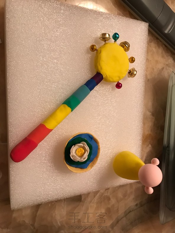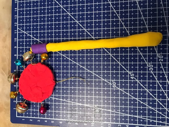 给孩子自制抓周粘土物品。自制摇铃。宝宝的成长中,需要一件父母自制的玩具。