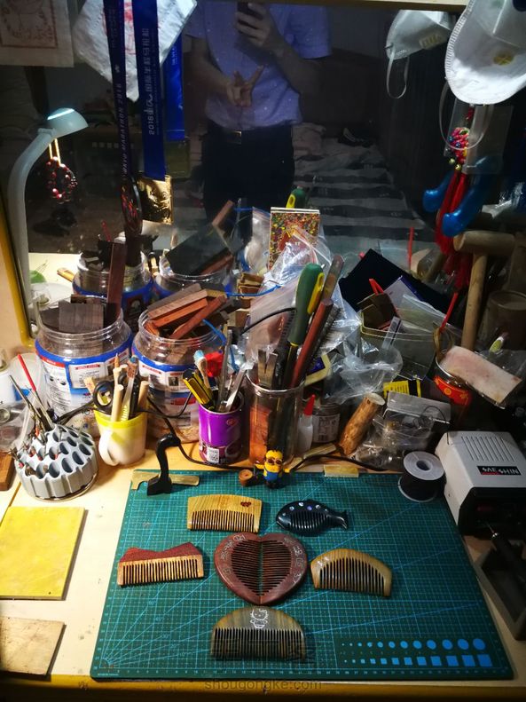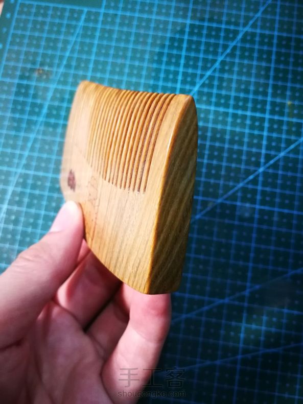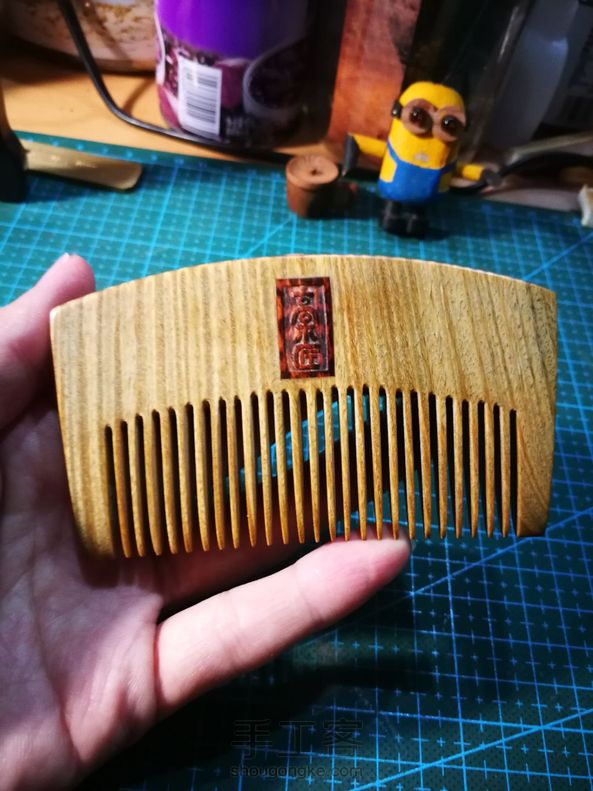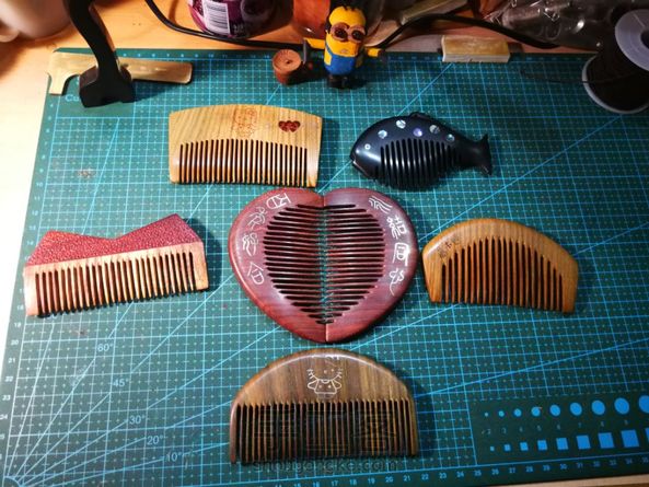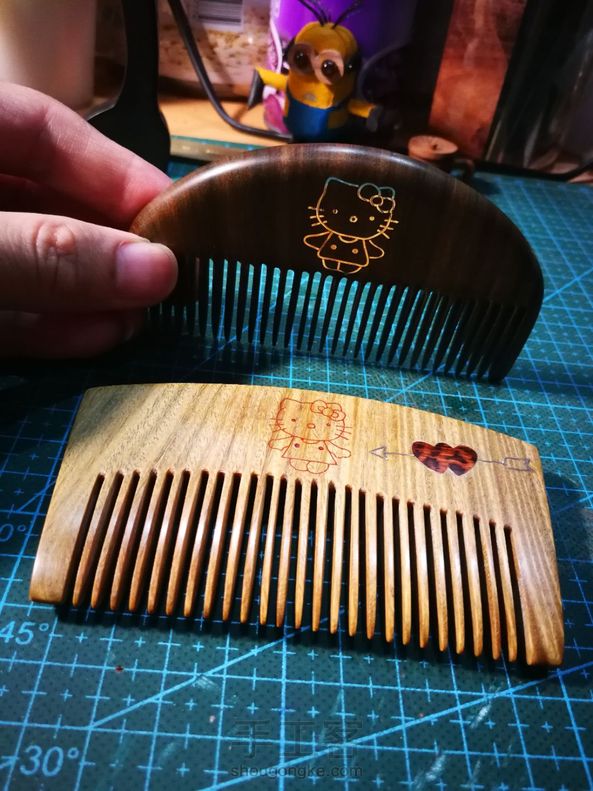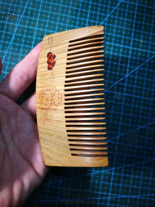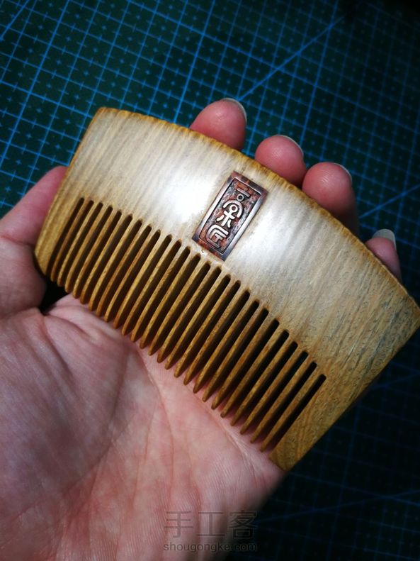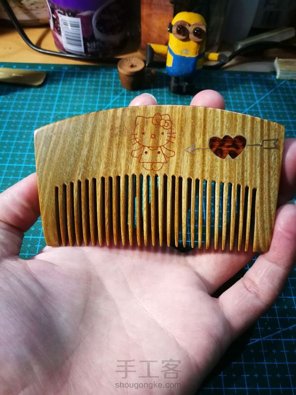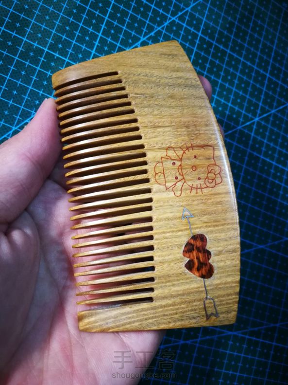 手工制作第十五把梳子 送领导的生日礼物,自己设计手工制作,陆续制作一周,礼轻情意重[害羞]独一无二的绿檀梳子,香喷喷的,采用新的工艺,正面嵌蛇纹木一箭穿心,箭用银丝镶嵌,Hellokitty嵌红花梨粉末,反面嵌蛇纹木,刻字高木匠。希望领导能喜欢😊 。