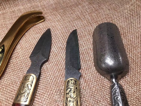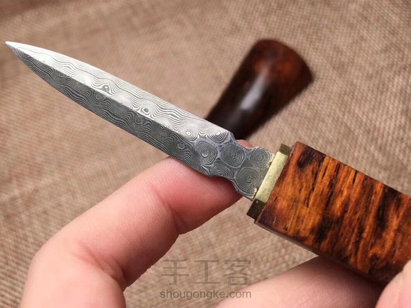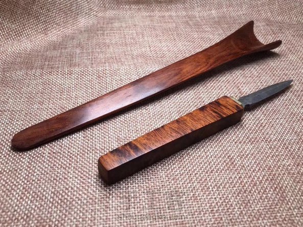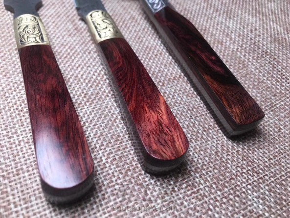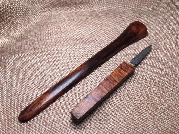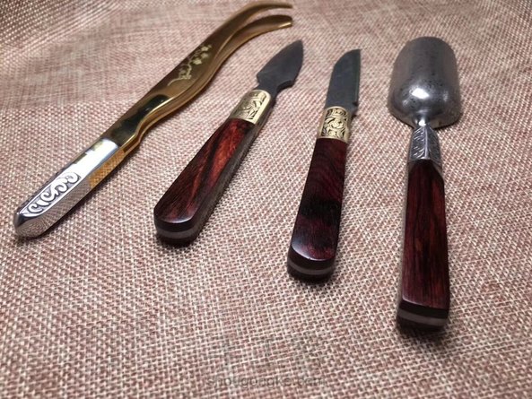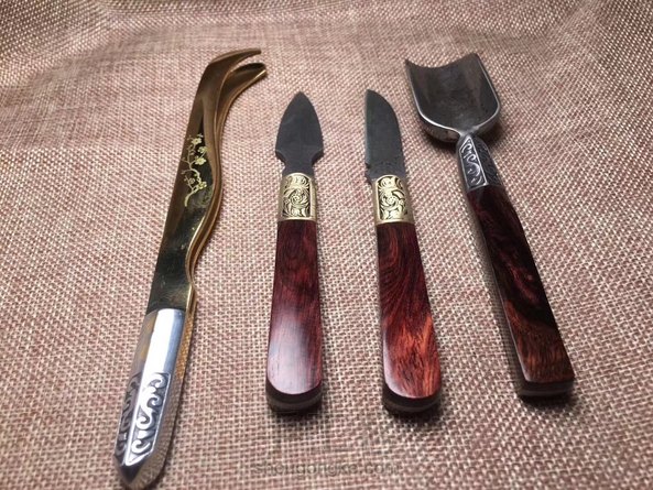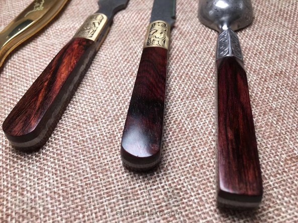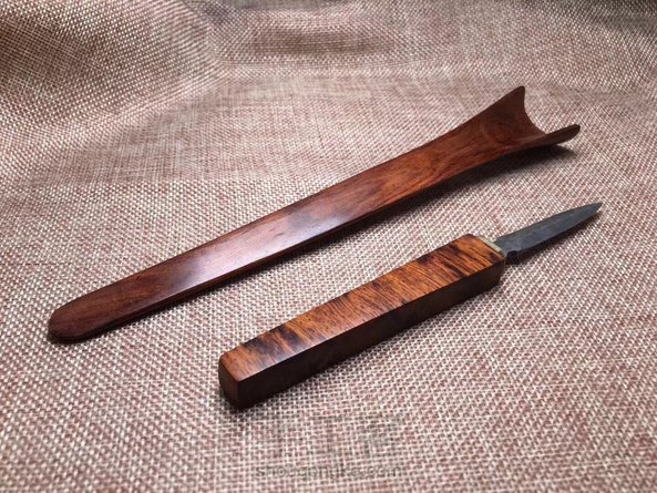 海黄油梨老料制作茶铲,木料材质纹路清晰流畅,细腻光滑,金属部分为大马士革钢,花纹错落有致