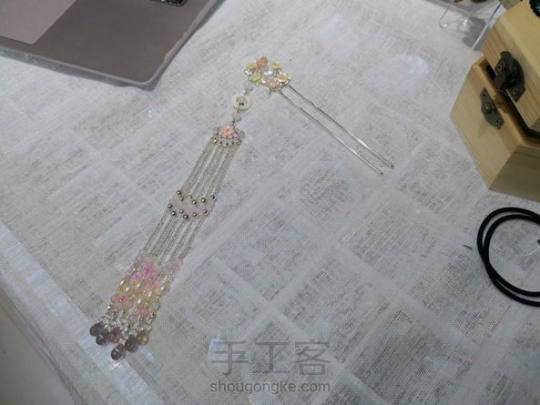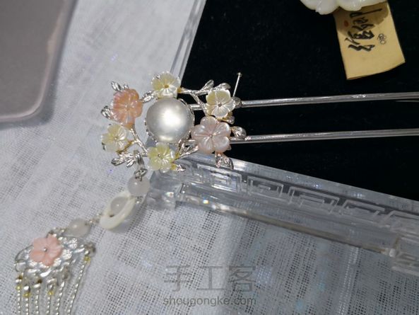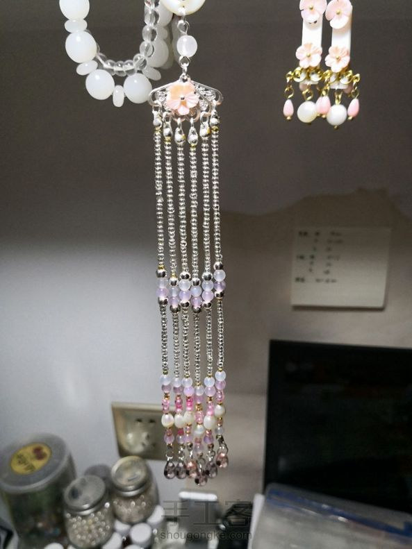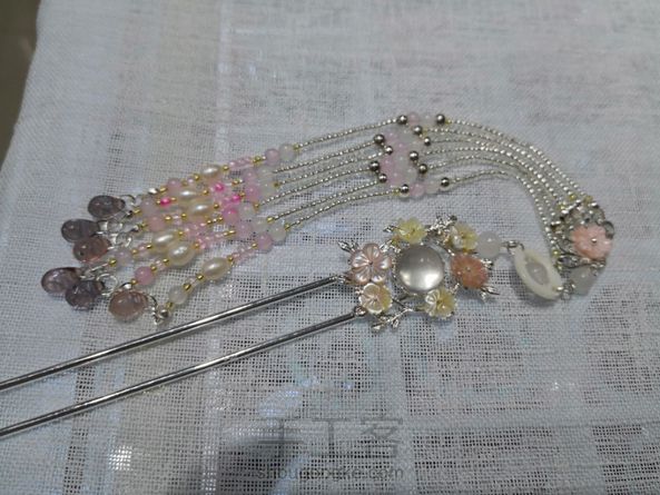 我是一个比较笨的人,认定一样东西就不会轻易改变。 以前都很喜欢金色,所以买的材料,做的东西都是以金色或者原铜色为主。 这次有妹子要求做一个银色的,于是就有了这支钗子。 水沫玉戒面,周围是贝壳花瓣,我用胶水粘的,最繁琐的应该是流苏了。 2mm的流苏串6根花了我将近3个小时时间,真的极度考验了我的耐心。