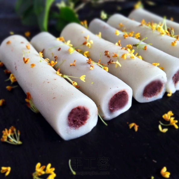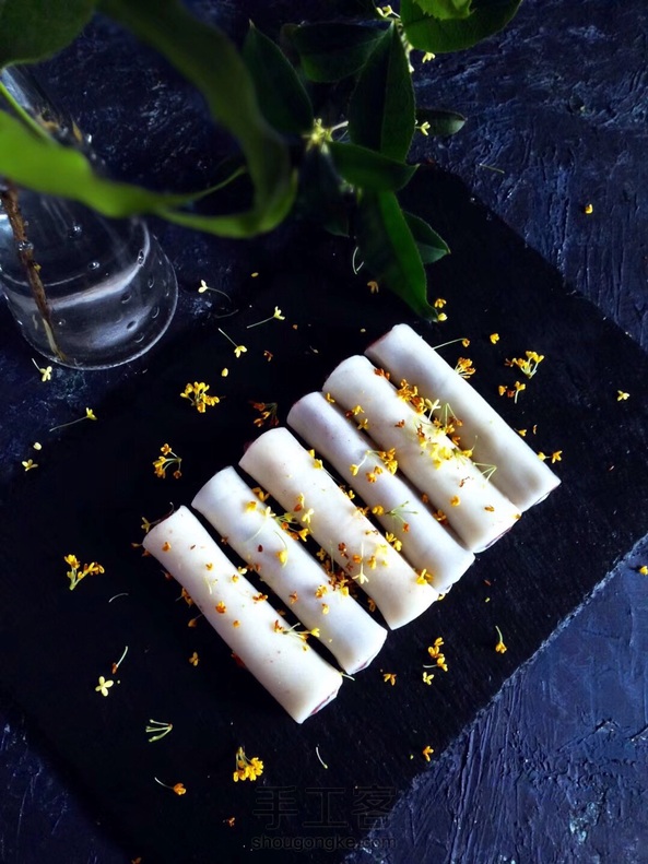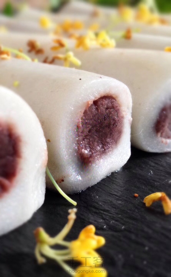 月色AAA:糯米粉和大米粉也可用澄粉十比三的比例加水加糖合成稍软一点的面团蒸熟,凉凉后加桂花酱揉匀擀成长方形片㰠豆沙卷好就就了