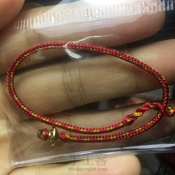 朋友是最近运气不佳,想带红绳,我就用六股红线和三股金线编了8股辫,用金色飞碟珠做扣。