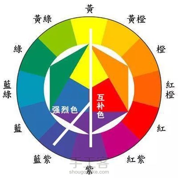 配色方案有两种,一种是互补色,一种是强烈色。强烈色是互补色左边的颜色,这个颜色对比最为明显。