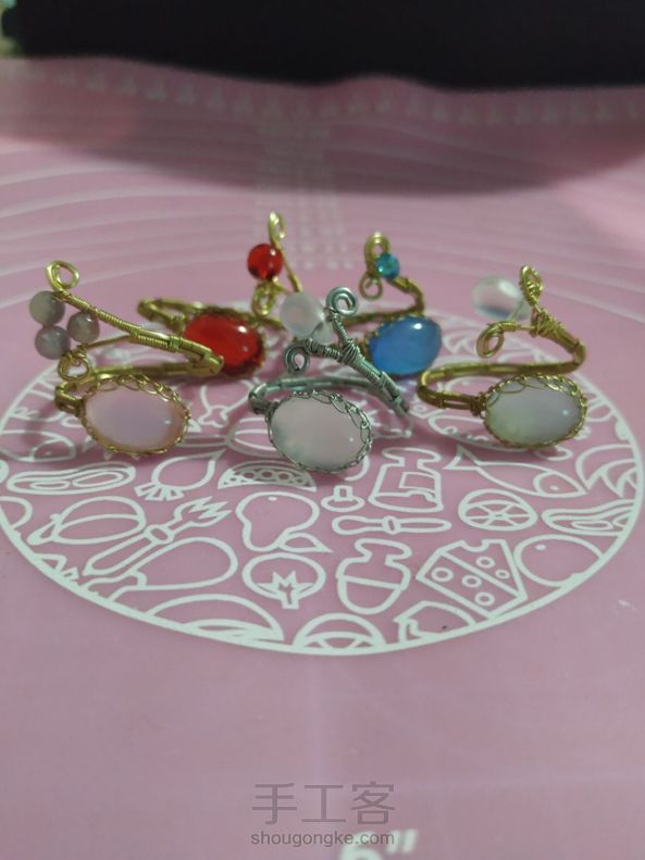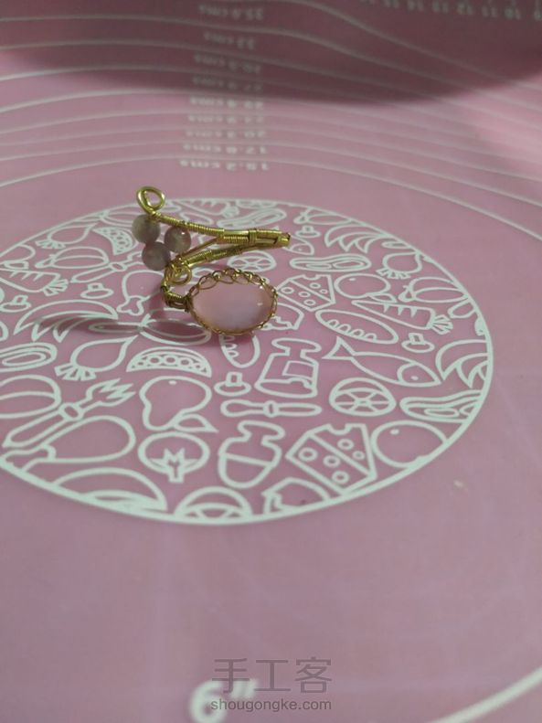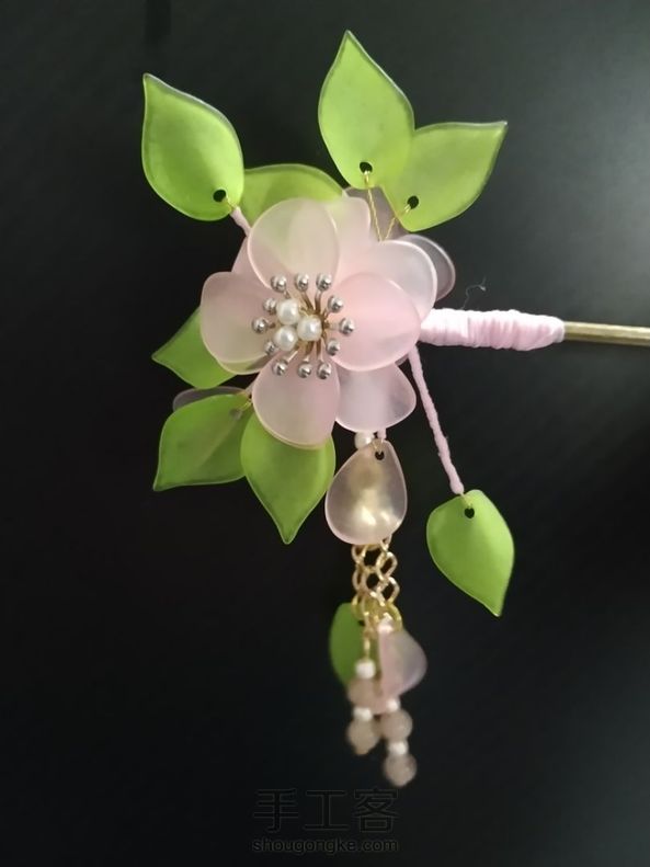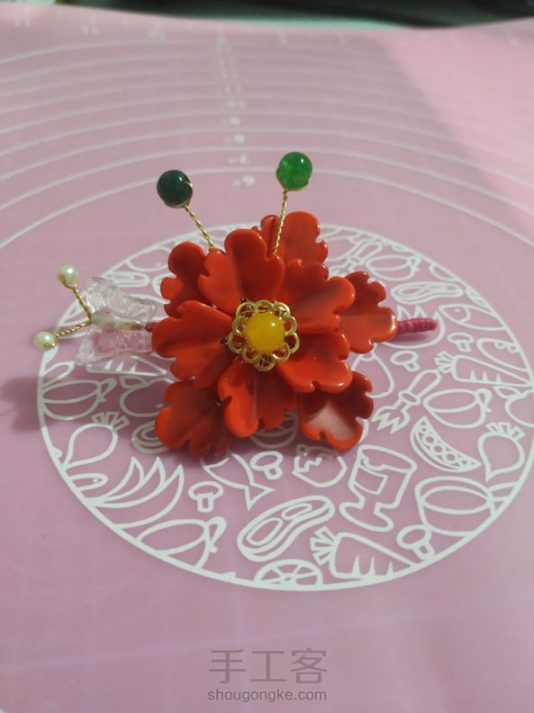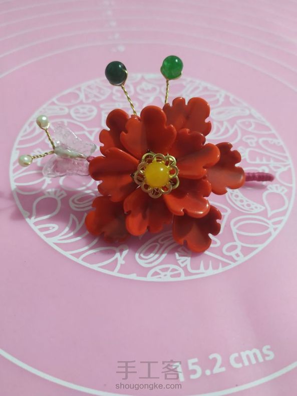 《很漂亮,感谢老师分享的教程,刚开始线选错了用的扁蜡线,导致花瓣上面有很多小孔,之后补救了一下串了一些珠子,成品很喜欢。》