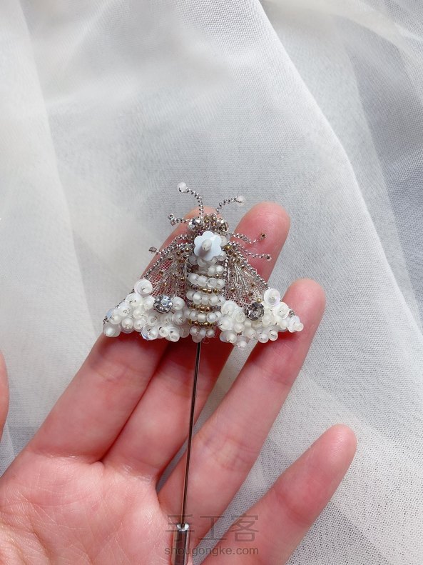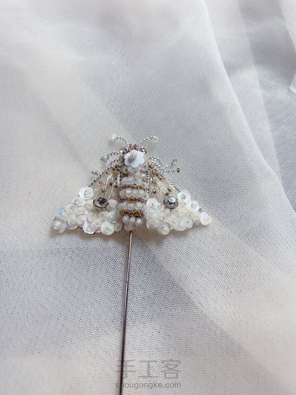 【原创】法绣白蛾|立体胸针 自认为白色和银色搭配还是很不错的,这里用了白色系的珠子亮片,与银色的印度丝相结合😊