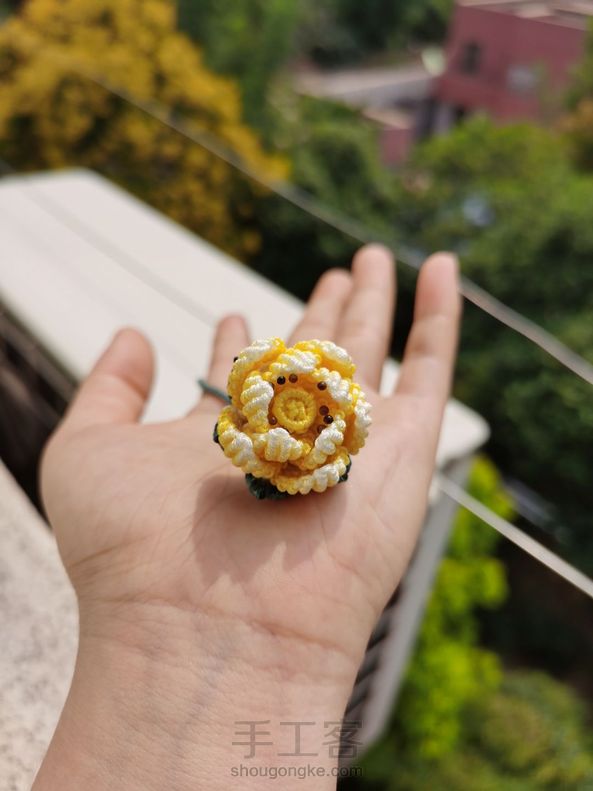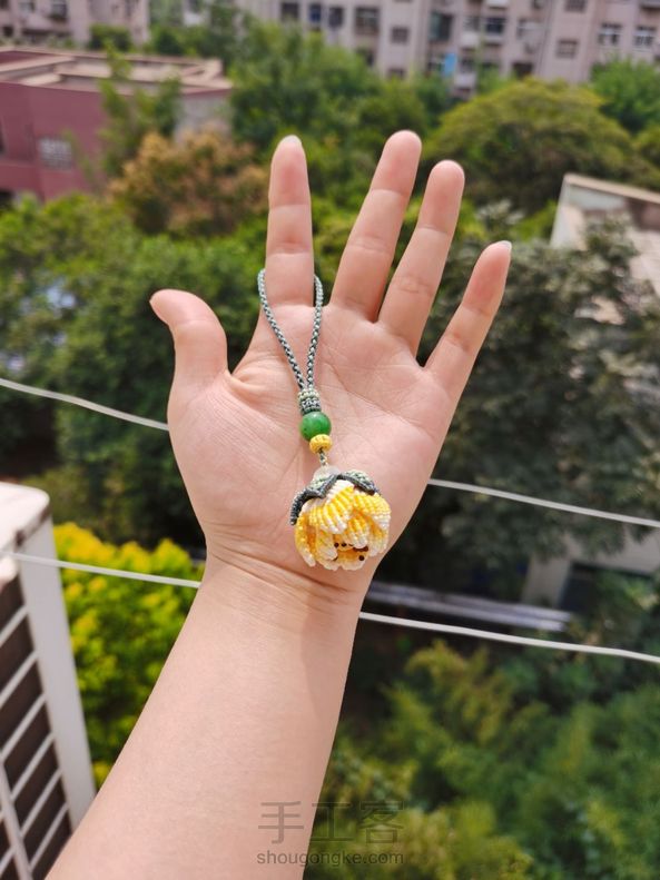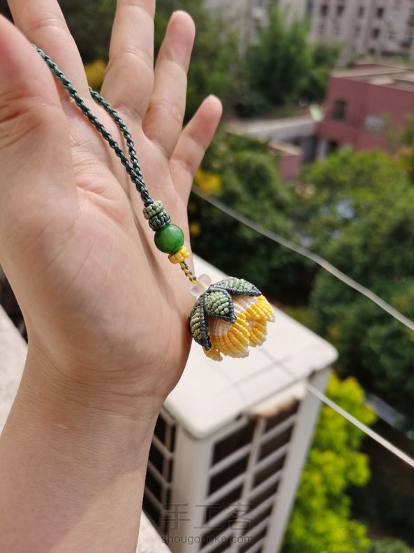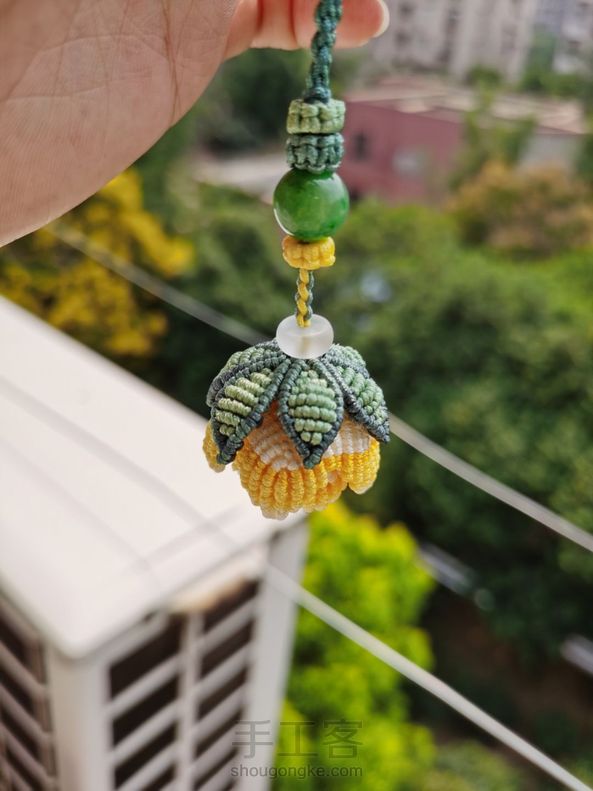 鹧鸪less 回复 狸猫:我瞎折腾的,六线或八线团锦结,取一根线做轴线,团锦结的线绕线,往下编,看情况减线,留两根线穿花瓣花托,其他线缕上去做蕊