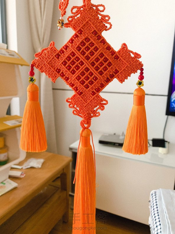 别人2天就能完成的挂件,我居然磨洋工磨了八九天。主要败在流苏上,要配一样的橘黄色或像似的流苏线实在太难了,找了好多家发来的都相差太大,好不容易找了一家色差不多的成品流苏,结果还被我浪费了一条。最后,流苏帽就没有用武之地了😂😂