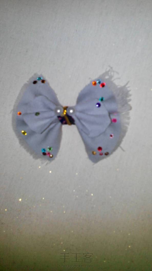 旧牛仔裤改造的头饰,咔嚓咔嚓几剪刀,做了一个蝴蝶结,不会戴它但是大家可以发挥想象,我裁的正方形布片,捏成蝴蝶结,然后给两边抽丝,就是抽线,呵呵,呆板的牛仔瞬间可爱了,做一个小蝴蝶结,小钻一通乱贴,嘎嘎,也是一个头饰呢,最爱蝴蝶结边边毛毛的感觉,我还是不会发教程