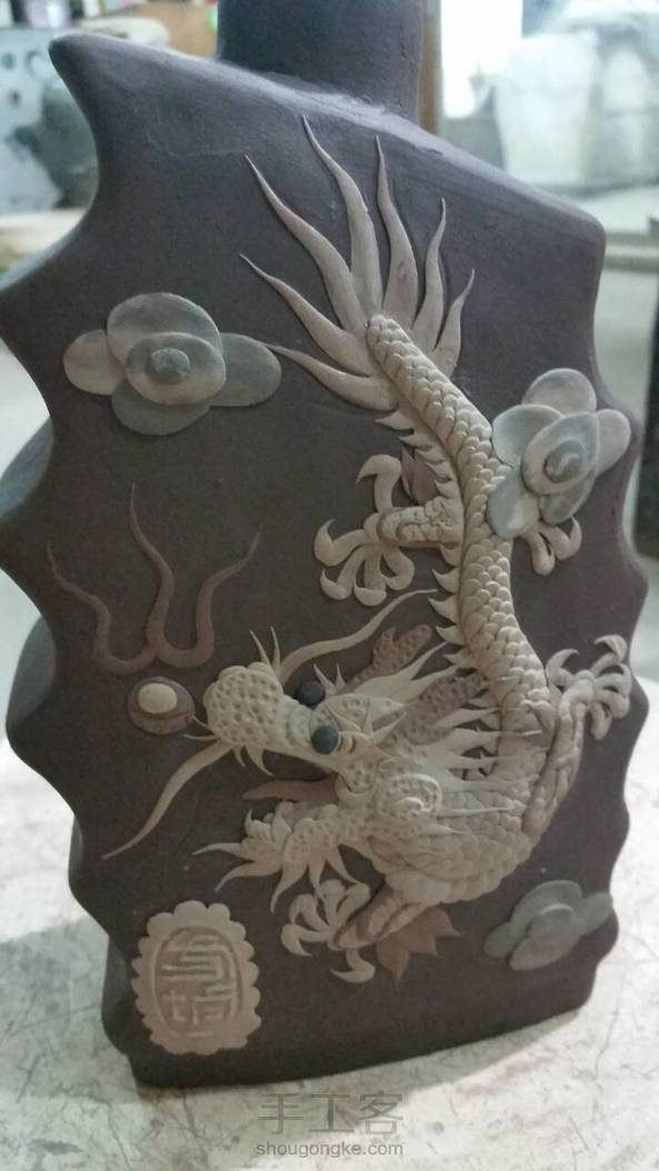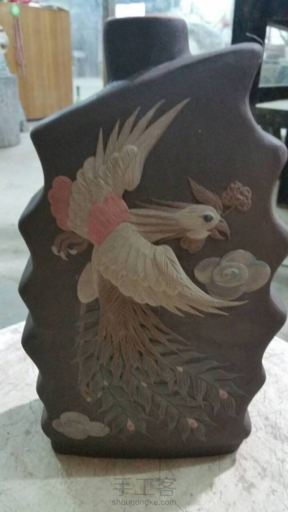 早安,阴雨绵绵的天气,湿冷的季节开始了。 龙凤呈祥小酒瓶,手指粗细的龙身体上的鳞片都是一片一片堆贴上去的,十分考验技艺 耐心与眼力。越是传统的画面,越考验制作者的基本功,没有扎实的基本功无法完成这反复又细腻的作品。
