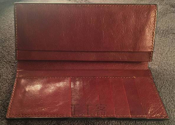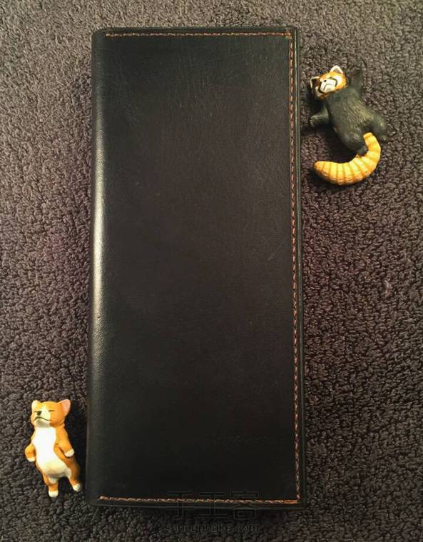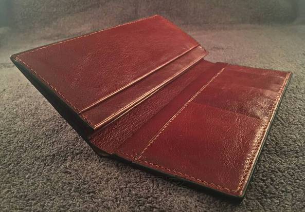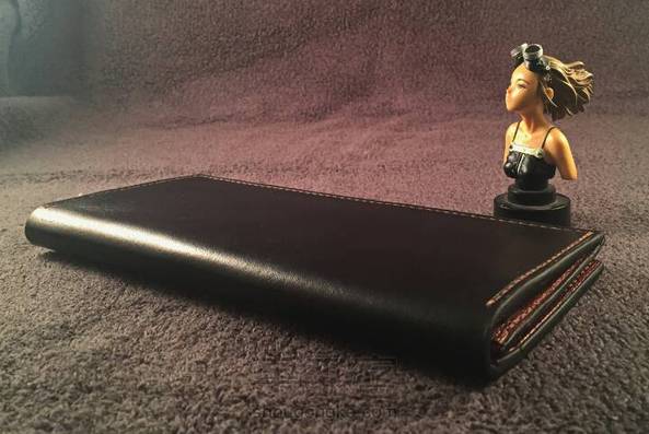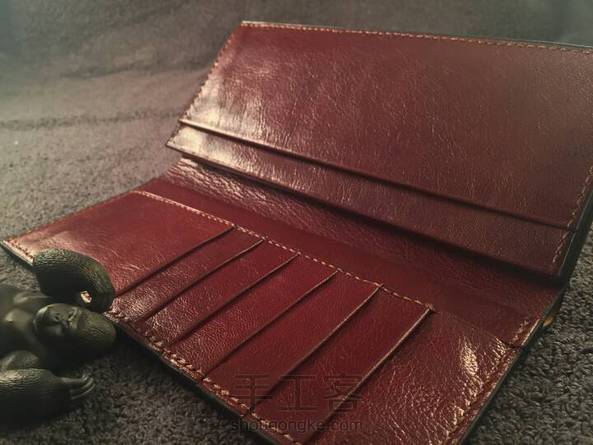 经典款长夹(双色) 皮料种类:外皮为手染原色植鞣牛皮 内皮为植鞣羊皮 皮料厚度:外皮1.5 内皮0.6-0.8 颜色:外黑内酒红 制作时长:40小时